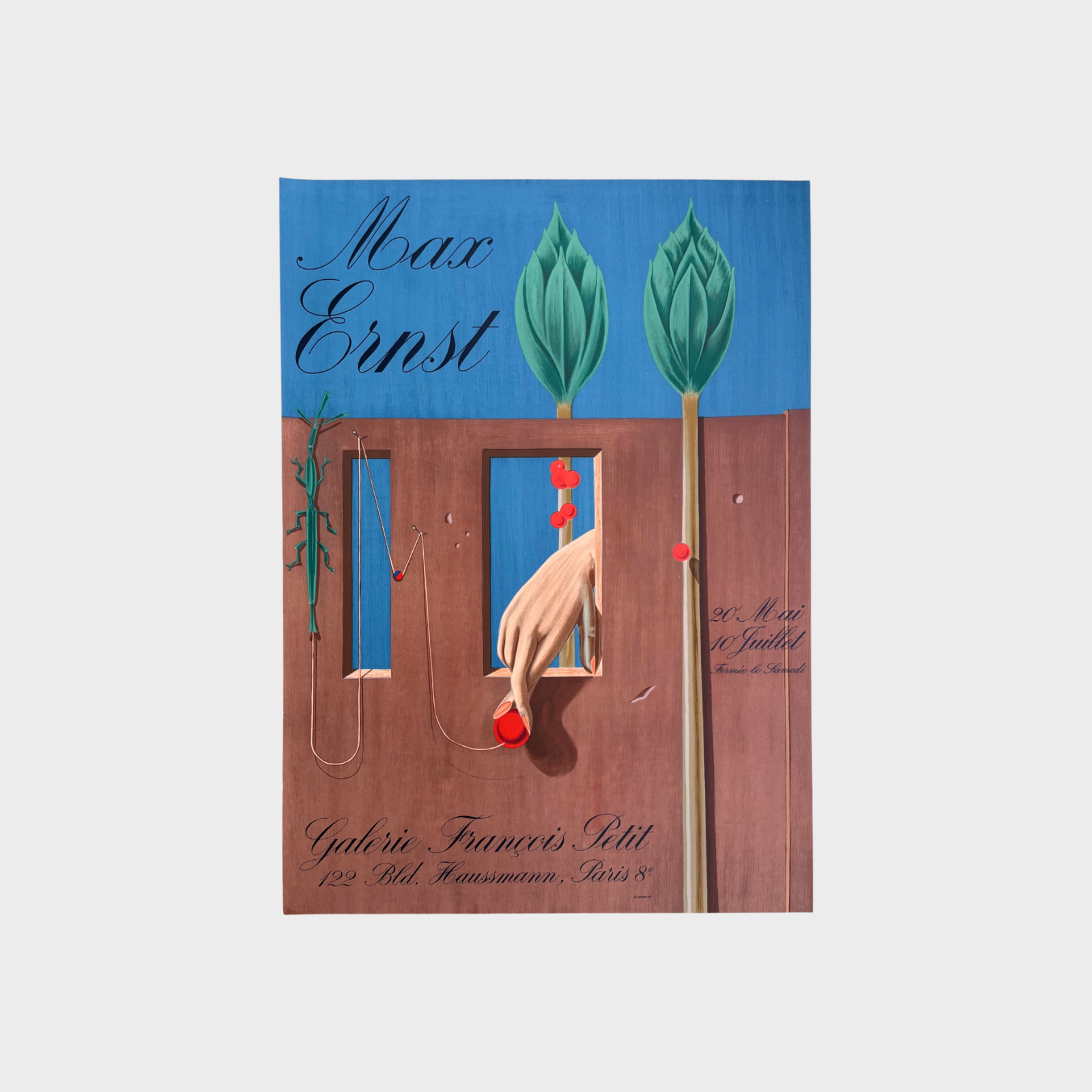Questo manifesto litografico è stato creato nel 1969 per promuovere la mostra di Max Ernst presso la Galerie François Petit a Parigi. Stampato dalla rinomata stamperia Mourlot, le dimensioni del manifesto sono 55×75 cm ed è in condizioni eccellenti, senza segni di usura o difetti visibili. L’immagine raffigurata è un tipico esempio del surrealismo di Max Ernst, con elementi enigmatici e onirici che evocano un’atmosfera di mistero e fantasia. L’opera riprodotta gioca su simbolismi visivi, come la mano che stringe una sfera rossa e due piante stilizzate che si innalzano verso l’alto.