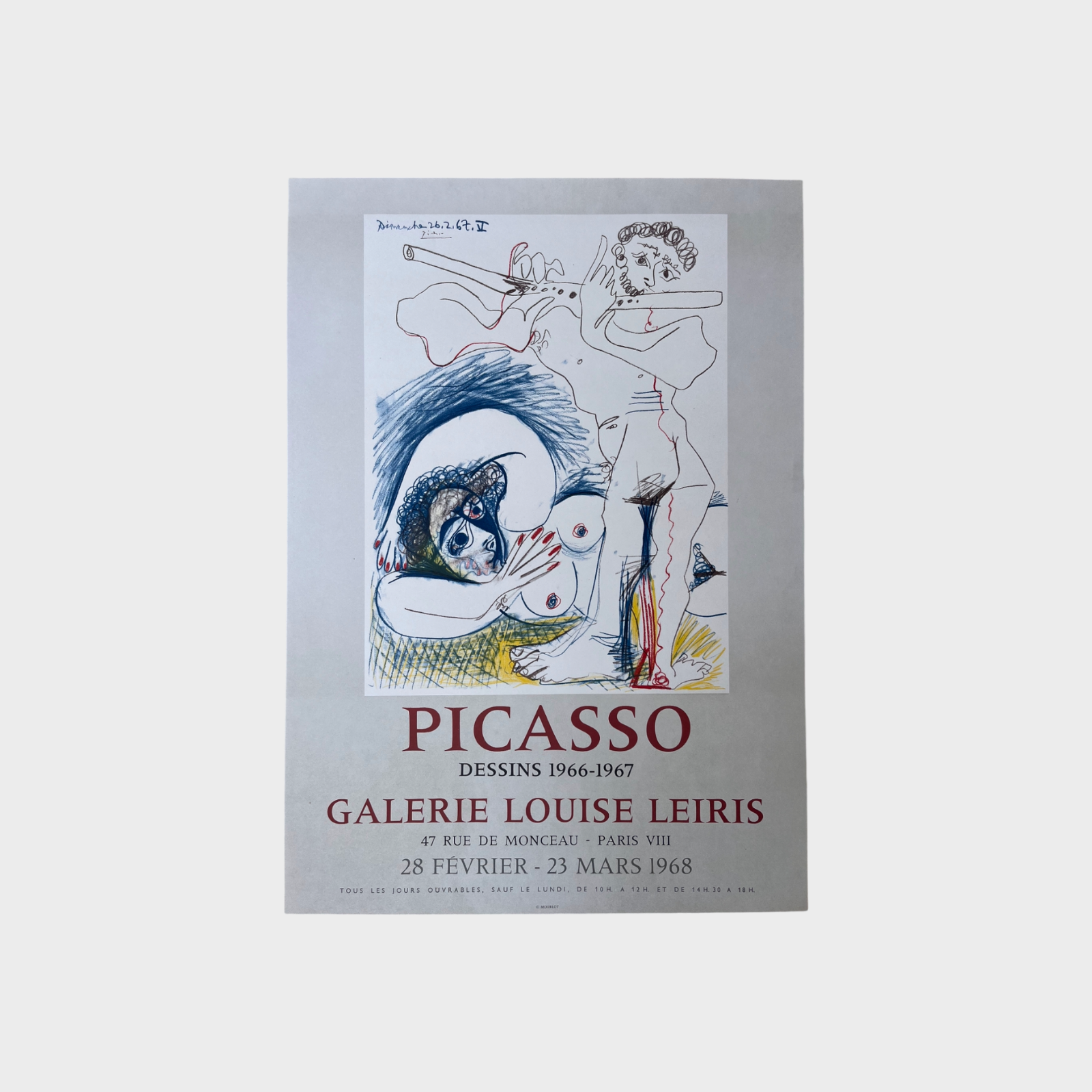 Raro manifesto litografico della mostra Dessins 1966-1967 di Pablo Picasso presso la Galerie Louise Leiris, Parigi, 1968.